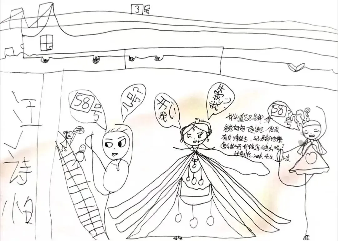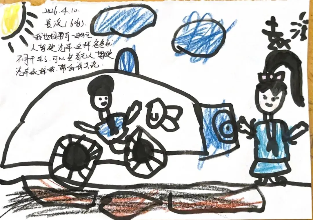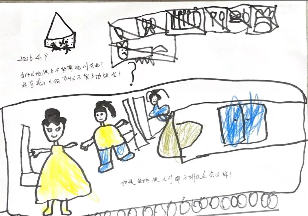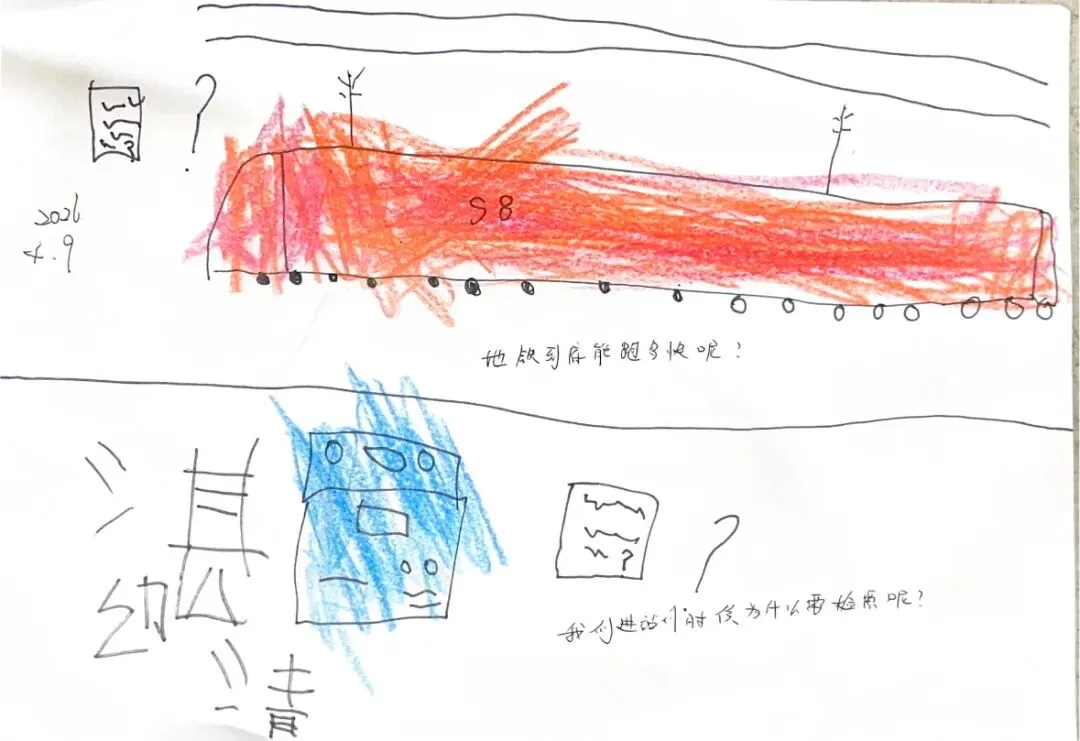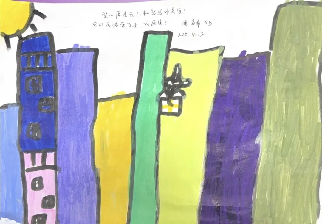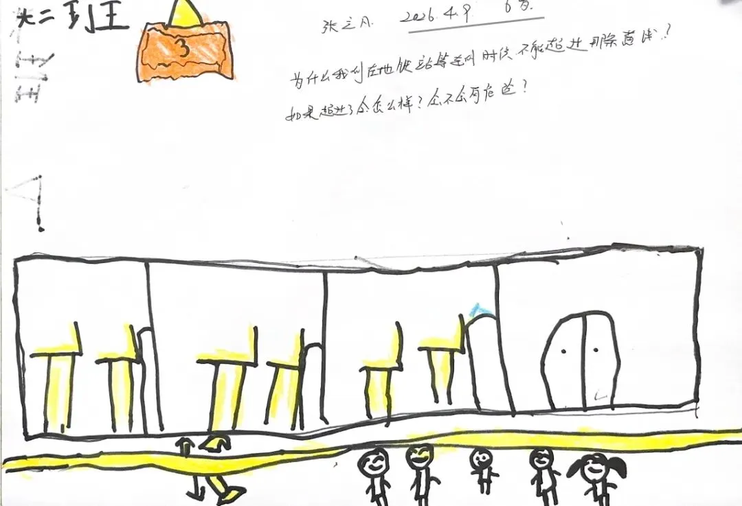 回到教室,孩子们迫不及待地用画笔“写下”自己的见闻。有的画了S8号线的蓝色车身,有的画了公交站台上长长的线路图,还有的画了一排整齐的共享单车。