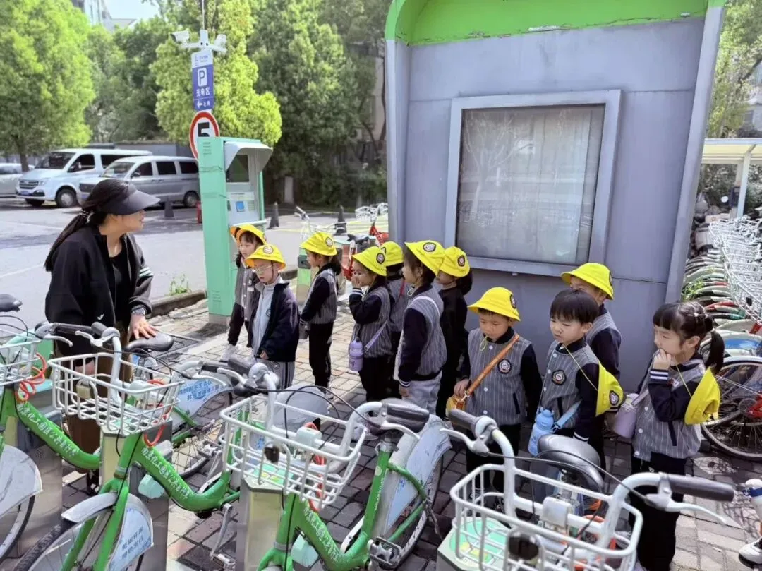 路边的共享单车引起了大家的好奇。孩子们蹲下来观察: