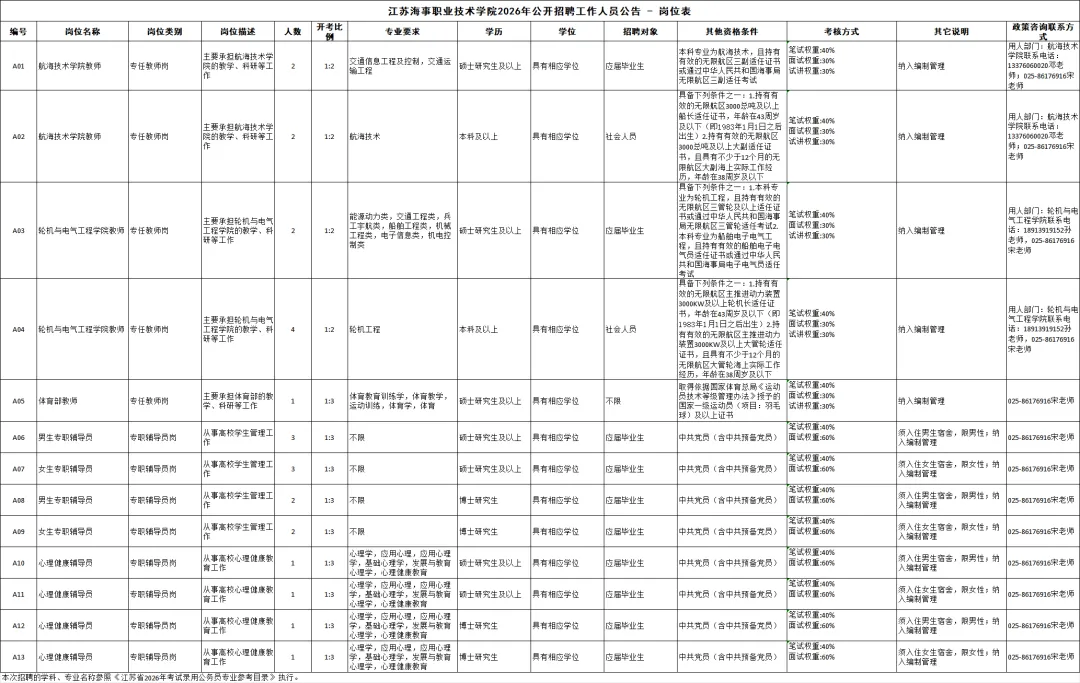 江苏海事职业技术学院人事处负责回答此次招聘政策咨询。