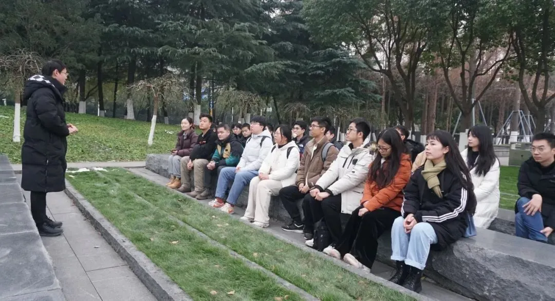 来到馆外,师生们在此开展了微党课的学习。郝磊同学简要介绍雨花台烈士陵园以及园内烈士群雕的相关背景,同时详细讲述了其中几位烈士的生平故事。我们能感受到烈士的忠魂离我们很近,他们是活生生存在于这片土地上的生命,这些英烈的精神光辉卓绝,坚贞不屈,是中国共产党人精神谱系的重要构成,感召着一代又一代共产党人为党和人民的事业前赴后继,不懈奋斗。我们在缅怀先烈的同时,也应继承和发扬他们的革命精神,努力奋斗,珍惜来之不易的盛世中华。