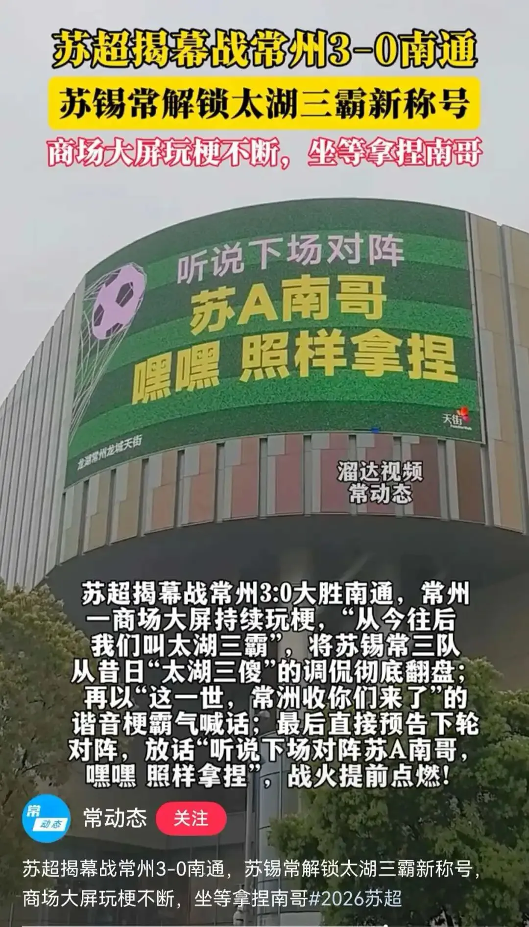 2026年 “苏超”揭幕战,常州对阵南通的赛场之上,那只通体红棕、身形扁实的充气恐龙意外“封神”,被网友笑称为“酱板龙”——一眼望去,油亮紧实的体态、扁阔敦实的轮廓,活脱脱一只成精的酱板鸭。这次出圈,小编猜测大概率是源自一群吃货网友的脑洞大开。