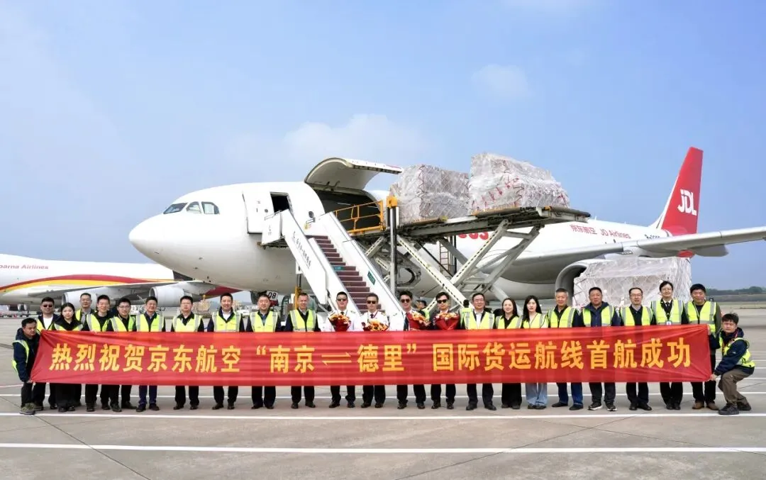4月15日,一架满载“中国制造”商品的全货机从南京禄口国际机场起飞,飞往印度德里,标志着“南京—德里”国际全货机航线正式开通并完成首航,成为南京临空经济示范区与京东航空合作开通的第3条国际货运航线,也是京东航空引进的首架A330全货机在南京机场的首航。该航线的开通,填补了南京直达印度的全货机运力空白,成功打通江苏地区至南亚的航空货运通道。