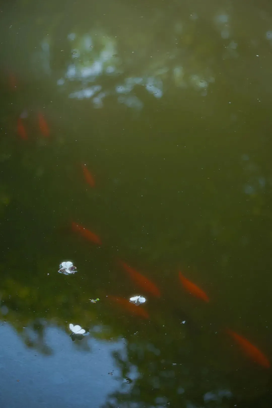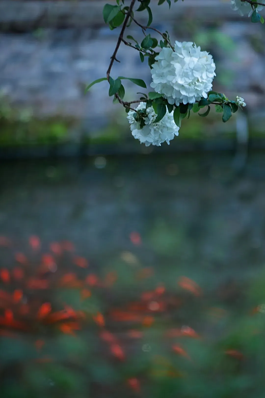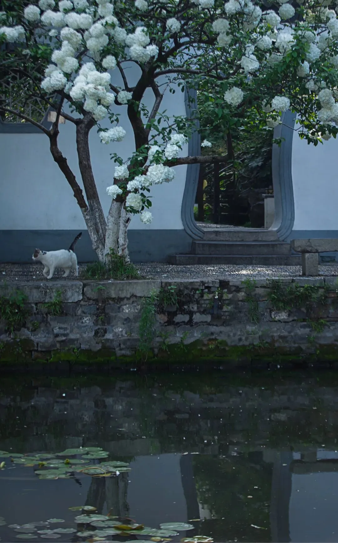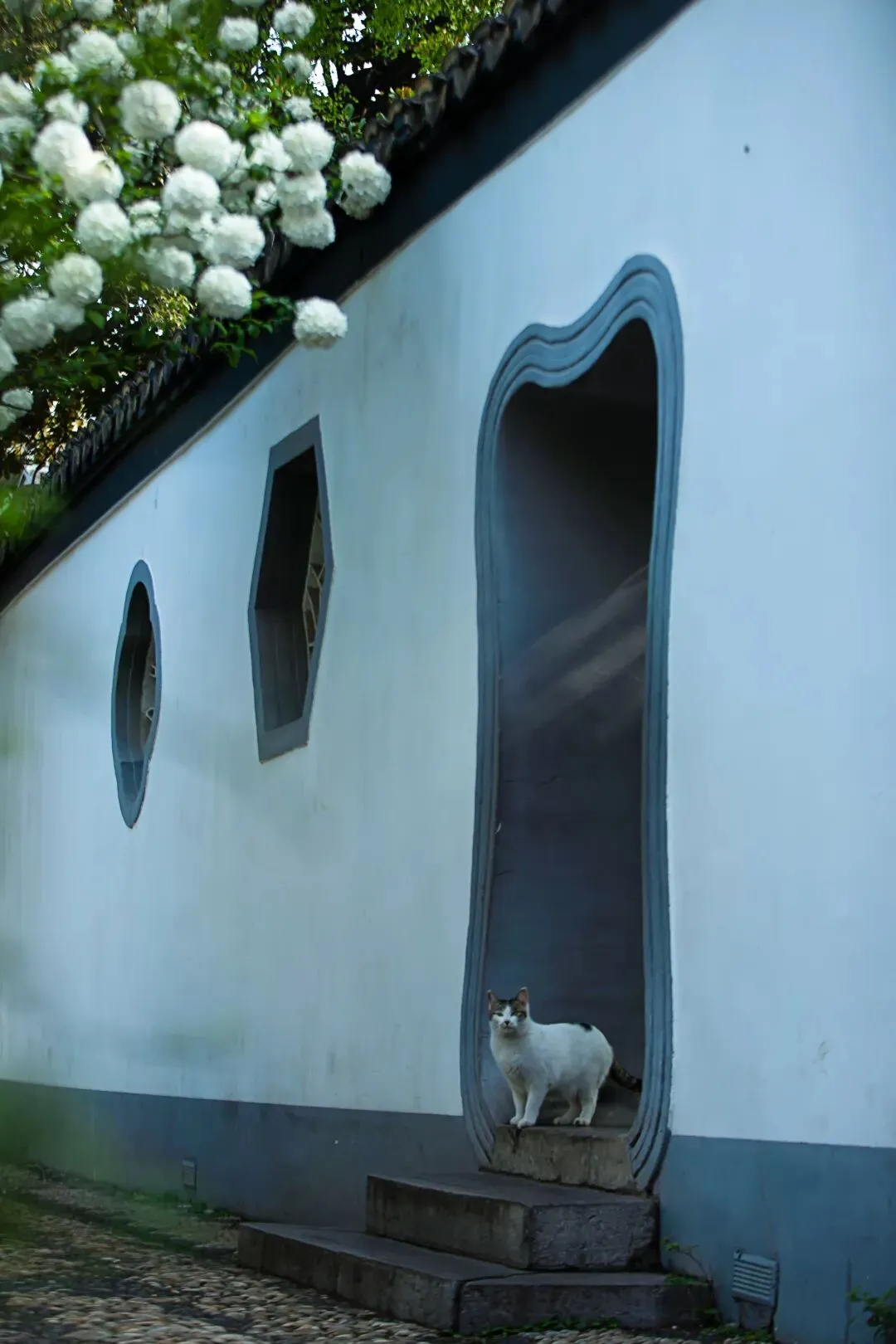 漫步白墙黛瓦间,偶遇慵懒狸奴,静观红鳞戏水。