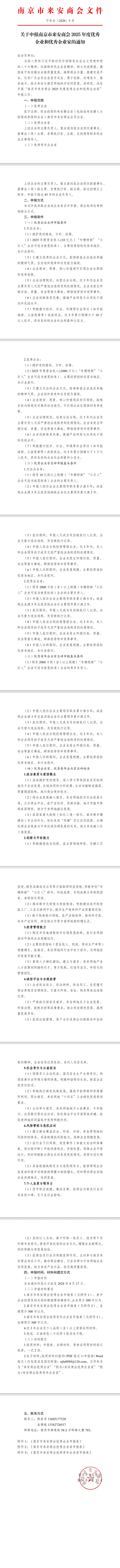>关于申报南京市来安商会2025年度优秀企业和优秀企业家的通知