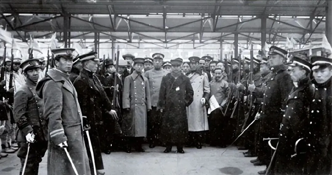 图里居中站着的男人就是孙中山,左手插袖,没什么派头,后头簇着一圈穿军服的青年,人人头上都压着盔帽,脸上挂着热气里的水光,有的张嘴正说话,有的眉头紧着带点戒备,身边士兵肩上端着新换的枪徽,刀鞘贴着腿,搭起来一条拦不住的人墙,那时候的“总统”二字刚进中国人心里,大多数人还没适应,现场挤着帮忙维持秩序的,有负责警戒的,还有那几个特意站得笔直的带刀军官,远边隐约有老百姓探头围观,衣服帽子跟仕绅不一样,混着点年节的感觉。