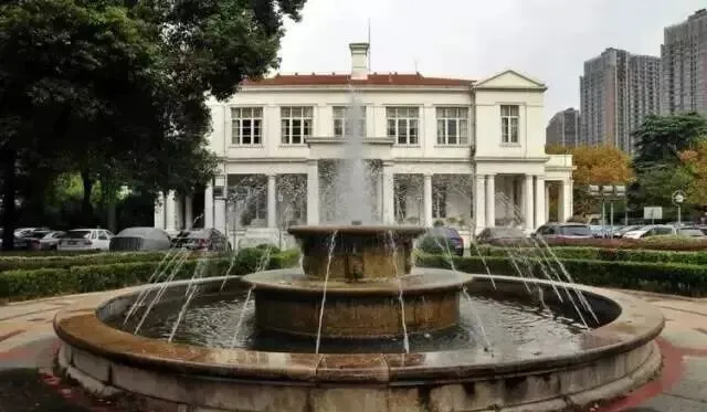 这座被称作“小白楼”的两层主楼,是英式新古典主义的典范之作:白墙配暗红陶瓦,中轴线对称布局,正面矗立罗马塔斯干柱廊,青石台阶直抵正门,檐下线脚工整细腻,转角处三根圆柱鼎立的设计,在南京民国建筑中独树一帜。